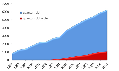图7,Web of Science数据库中量子点及量子点生物学相关论文发表情况。